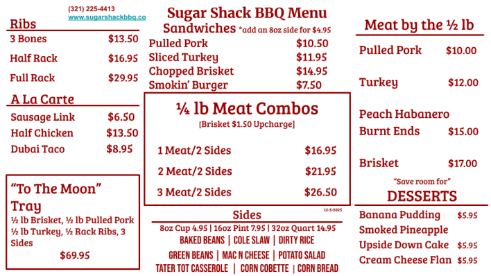 A feast fit for a BBQ lover! Includes ½ lb Brisket, ½ Rack of Ribs, ½ lb Pulled Pork, ½ lb Turkey, and 3 sides of your choice. Perfect for sharing—or tackling solo if you’re feeling bold! - $69.95